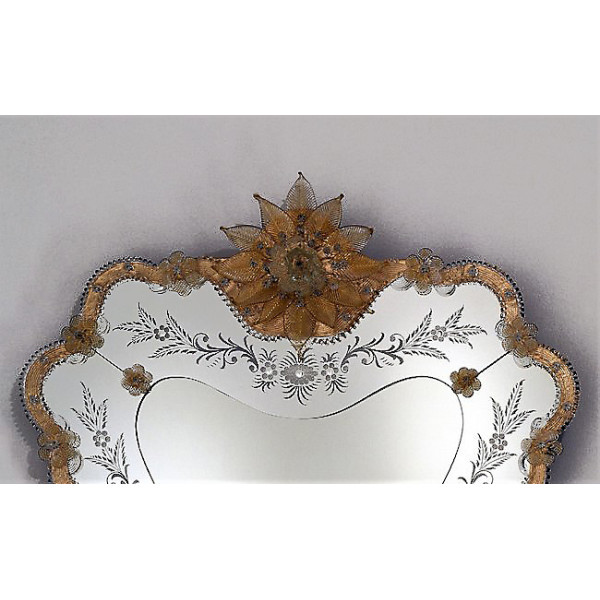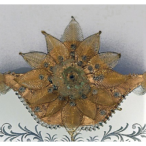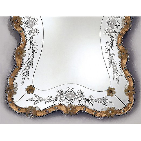 Зеркало из муранского стекла "Казанова" в венецианском стиле, изготовленное искусными руками мастеров Мурано, рама из фигурного хрусталя из муранского стекла на золотом фоне, гравюры, украшающие это роскошное зеркало, полностью выполнены вручную, а отделка из роз и листьев различных размеров выполнена из хрусталя с 24-каратным золотым листом. они отправляются украшать это замечательное зеркало, изготовленное в лаборатории братьев Този на острове Мурано.