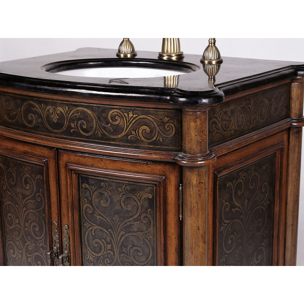 Контрастная отделка дверей и панелей придает этой мебели особую изысканность. Столешница из черного гранита дополнена фарфоровой раковиной. Доступны варианты с зеркалом.