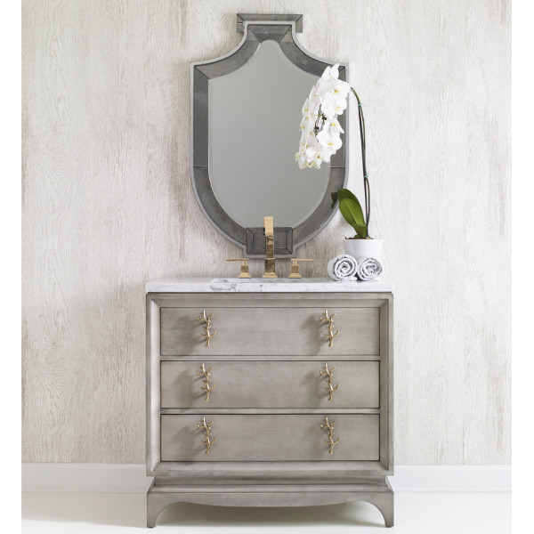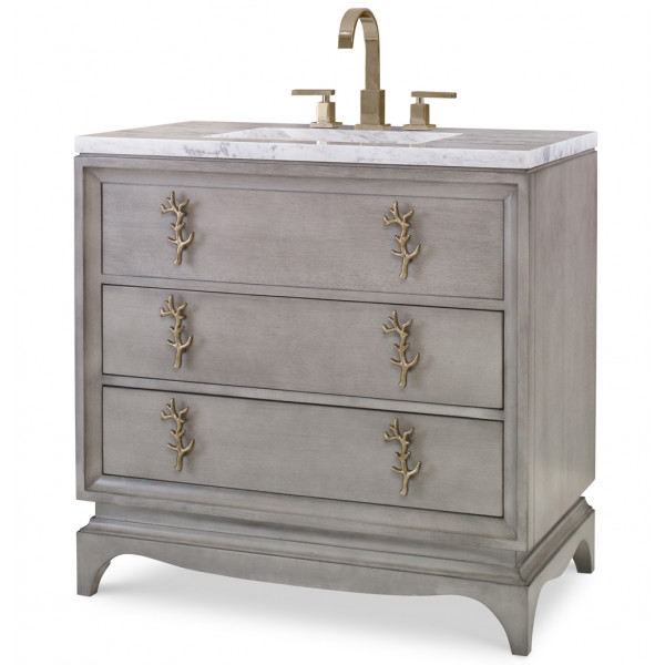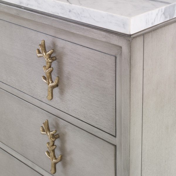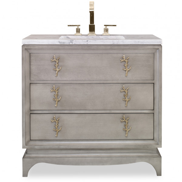 Этот комод для раковины из красного дерева имеет теплую серую отделку и столешницу из белого мрамора Carrera. Два рабочих ящика дополнены латунными задвижками коралловой формы. Комод установлен на резном основании в стиле шинуазри. В комплект входит фарфоровая чаша для раковины.