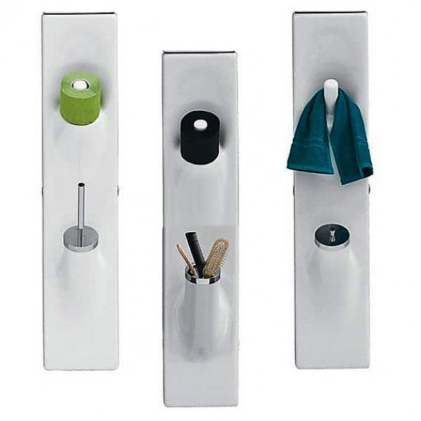 Sotto Sopra керамическая система аксессуаров для ванной ArtCeram состоит из керамической панели (керамической базы) в верхней части которой находится крючок (он же жержатель туалетной бумаги или полотенца), в нижней части свободный слот для размещения (на выбор):