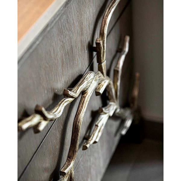 Изготовлен из дерева Минди с дубовым шпоном. Декоративная ветвь из литой латуни составляет визуальное единое решение, соединяя вместе ножки и ручки.