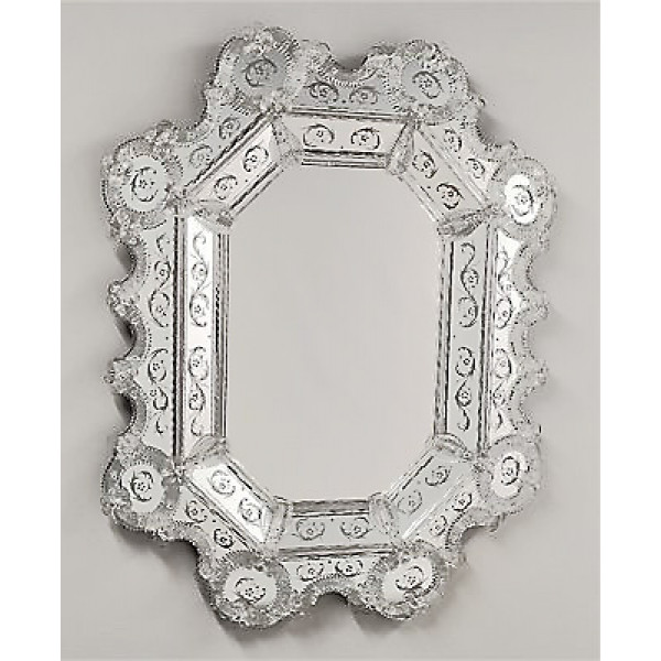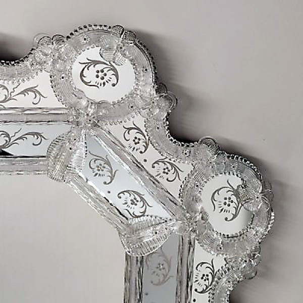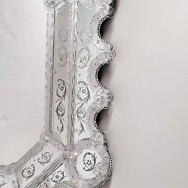 Зеркало состоит из центрального восьмиугольника с хрустальной и серебряной рамой из муранского стекла и украшено завитками из муранского стекла, все это на серебряном фоне, украшено деталями в виде хрустальных цветов, все зеркало украшено цветочными и фигурными гравюрами, выполненными в технике but no.