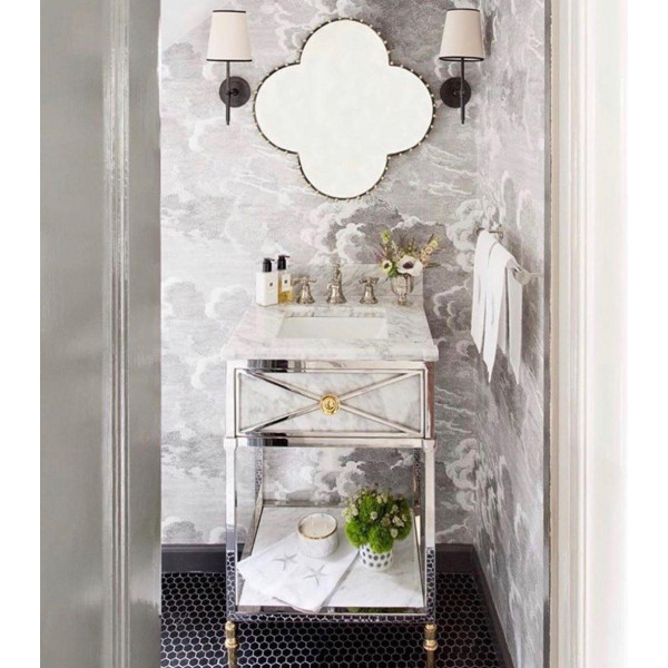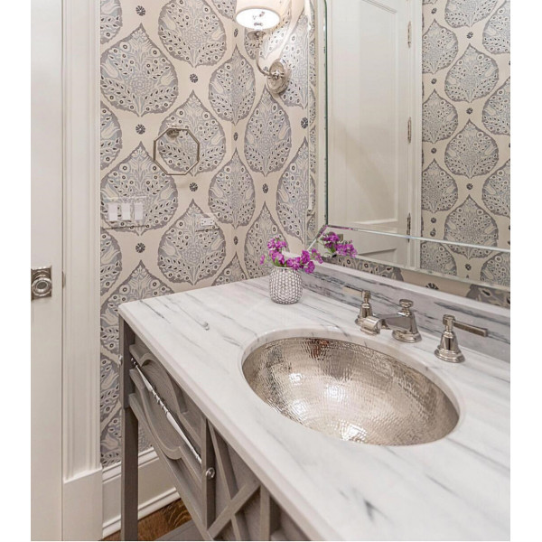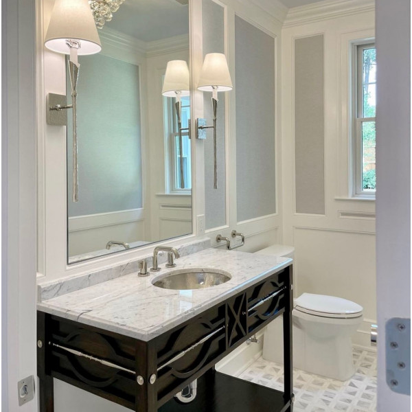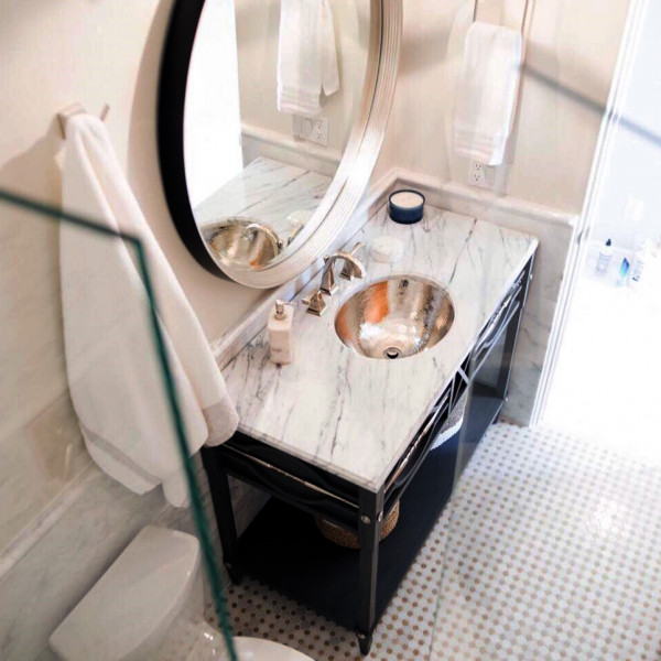 Верх - белый мрамор Bianco Giulia с овальной полированной раковиной из латуни с финишем глянцевый никель.