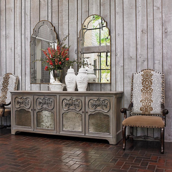 Изготовлено из массива красного дерева в античной белой отделке с акцентами античного золота или серебра. Двери с деревянными лаврами ручной работы и антикварными зеркальными панелями скрывают открытое хранилище под раковиной.