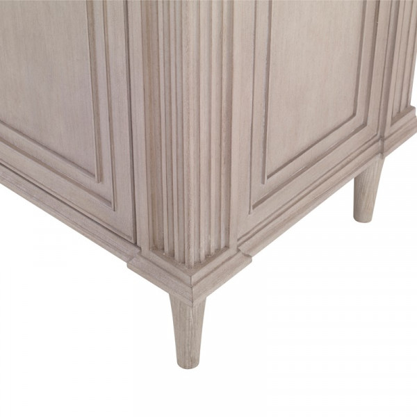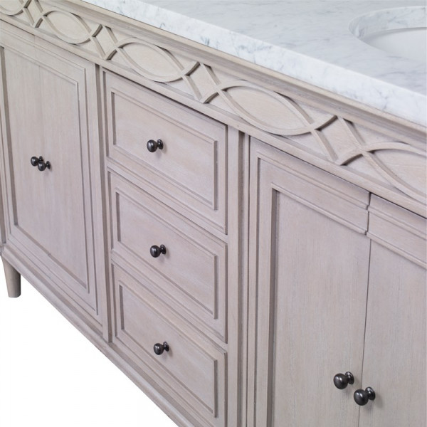 Фасад мебель имеет геометрический узор, который переходит с передней на боковые стороны. Массив отделан французским белым цветом.