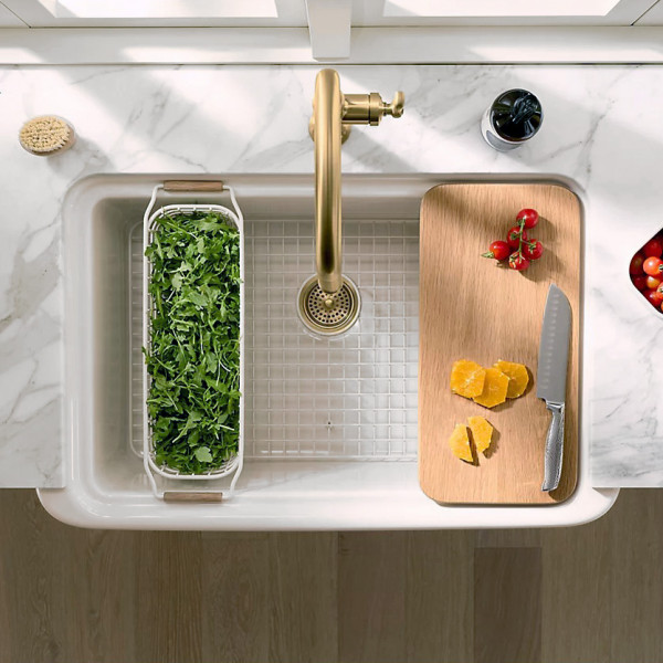 Проволочная корзина и дуршлаг, покрытые порошковой краской в тон мойки, а также разделочная доска из массива белого дуба располагаются на встроенном выступе и легко выдвигаются, что обеспечивает максимальную организованность кухонной мойки.