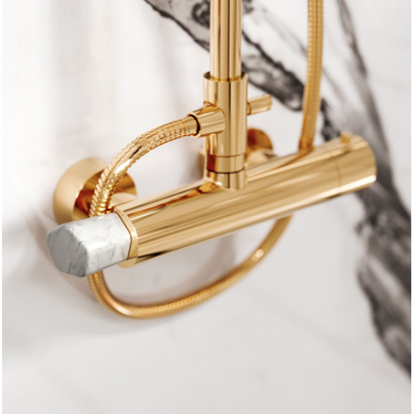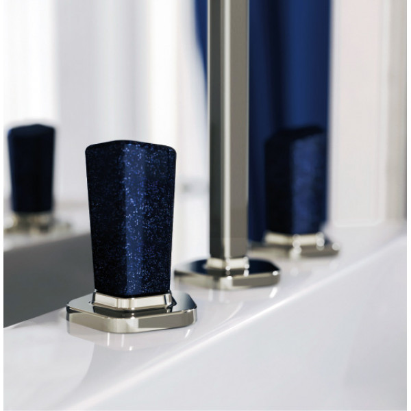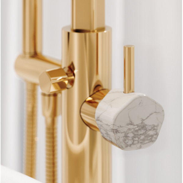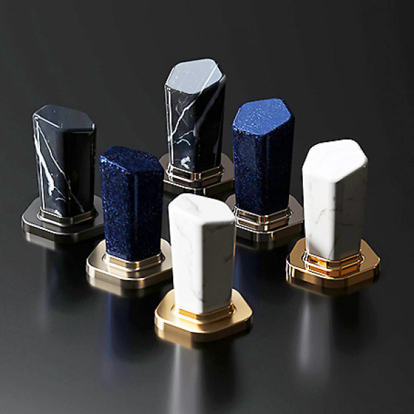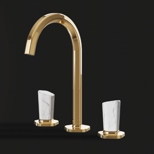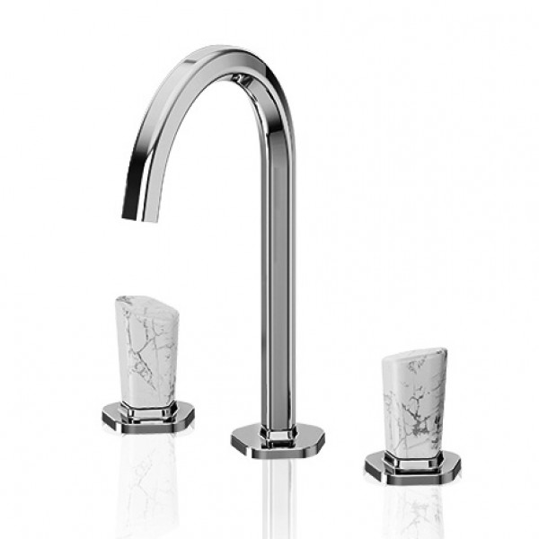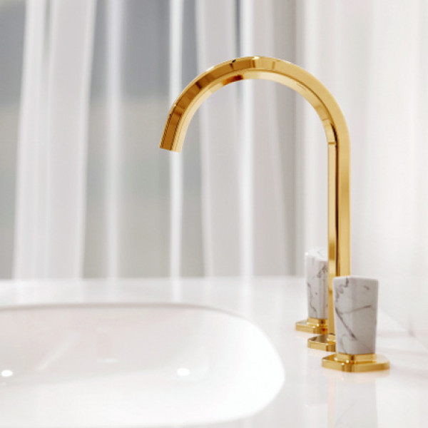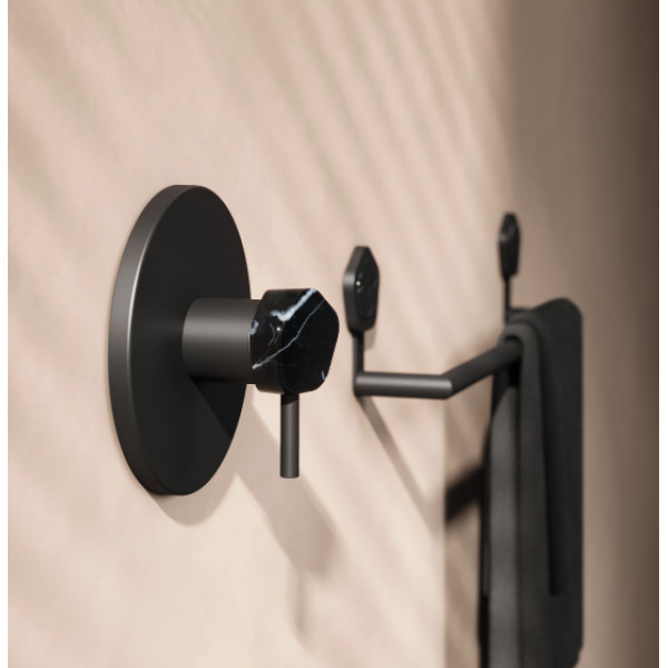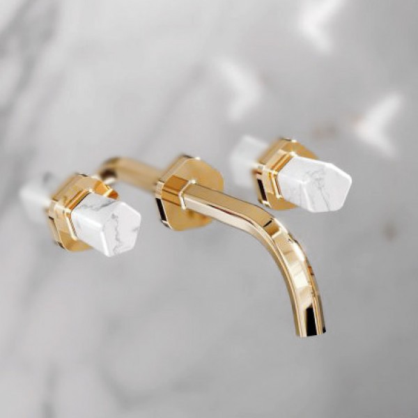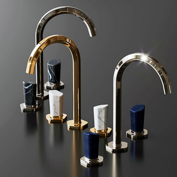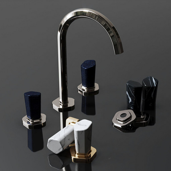 Словно вырастающие из фигурных розеток, выточенные из цельного камня объемные ручки задают новую эстетику в дизайне ванной: натуральный камень как полноценный функциональный элемент декора.