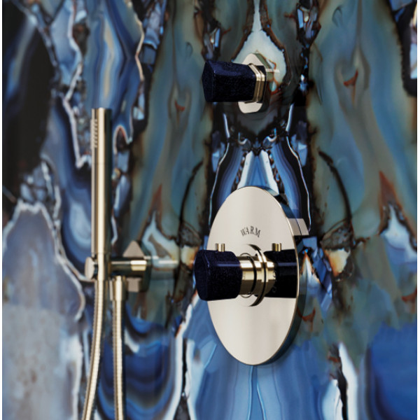Интригующе-искрящаяся синева авантюрина, гордая выразительность чёрного мрамора или нежное очарование белой бирюзы – выбор декоративного камня и металла-компаньона подает яркие идеи для смелых стилевых решений интерьера ванной в целом.