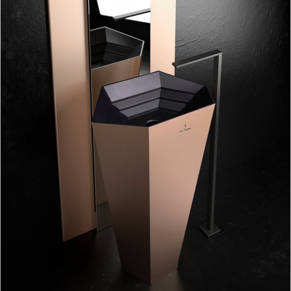 Логотип бренда Tonino Lamborghini, незаметно размещенный на фронте умывальника, способствует определению сильной и узнаваемой личности в индустрии роскоши.